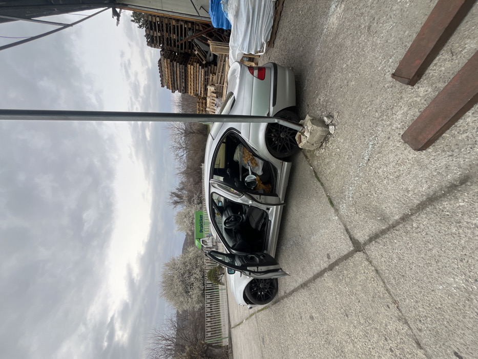 An outdoor scene in Dupnitsa, Bulgaria, features a silver four-door sedan parked on a cracked concrete surface under an overcast sky. The vehicle's front and rear driver's side doors are open, revealing black interior upholstery and various items, including a light-colored object and orange/brown items, within the rear passenger compartment. The car is equipped with black multi-spoke aftermarket wheels and appears lowered. A vertical metal pole, supported by a damaged concrete block, is positioned near the vehicle's rear passenger side. Two reddish-brown rectangular metal bars lie on the concrete in the lower right foreground. In the background, beyond a white metal fence, a green box truck with the "Praktiker" logo is visible. Bare and blooming white trees, along with distant hills, line the horizon. To the right, a large stack of wooden pallets is present next to a building structure, with blue wrapped materials on the ground nearby. No individuals are visible.