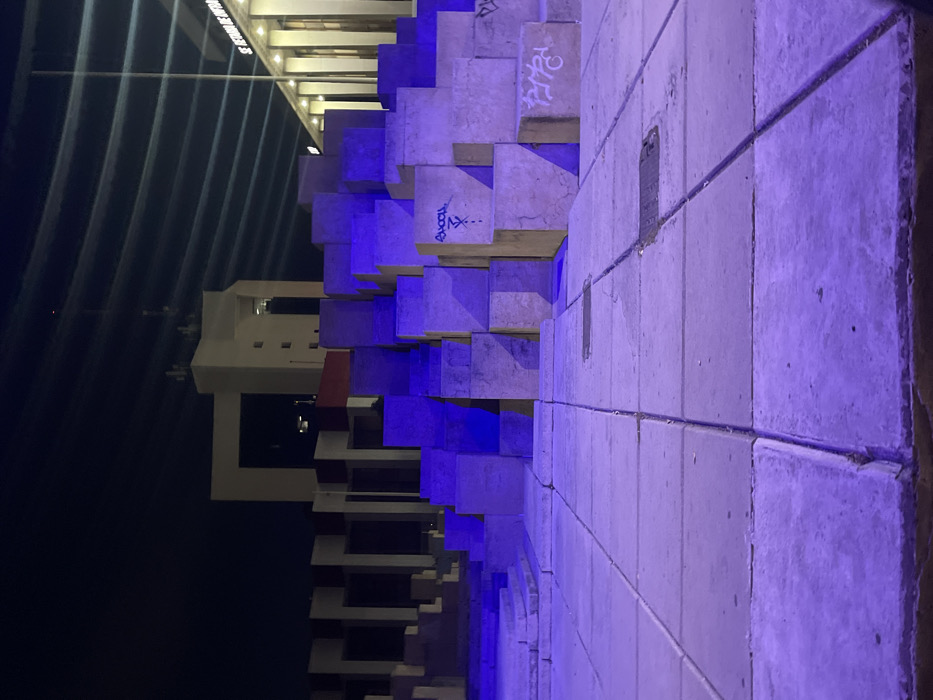 The photo showcases an urban architectural space at night. There is a wall constructed with rectangular blocks with some graffiti. To the left, a structure with visible levels and a facade featuring rectangular openings is visible. Parallel beams, potentially part of a bridge or building element, extend into the dark sky above. The image is bathed in a blue-purple light, accentuating the textures of the wall and architectural details.