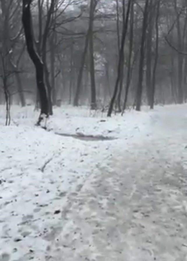 snow-covered path winding through a wooded area. The trees are bare, and the ground is covered in a layer of snow with visible footprints. The sky is overcast, creating a muted, gray light. A small puddle of water is visible on the left side of the path. The overall scene conveys a quiet, winter atmosphere.