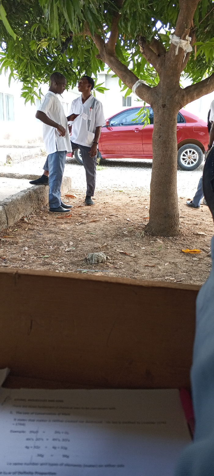 The image depicts an outdoor scene in Keffi, Nigeria, likely on the grounds of a medical or educational institution, given the attire of the individuals. Two males, appearing to be young adults or medical students, stand conversing under the shade of a deciduous tree with green foliage. The individual on the left wears a white, short-sleeved tunic over blue jeans and dark dress shoes. His hands are near his waist. The individual on the right, facing the first, wears a white V-neck scrub top with a small pen holder pocket containing a red pen, grey trousers, and dark slip-on shoes. He holds a small white paper or card in his left hand and has a white strap or lanyard hanging from his neck. Both individuals appear engaged in a conversation, with the person on the right looking towards the person on the left. Behind the two individuals, a red four-door sedan is parked on an unpaved surface. A light-colored building with windows is visible in the background, partially obscured by the tree and the car. The ground is dry, light brown soil with scattered leaves, debris, and small stones. A low concrete curb runs horizontally across the mid-ground, separating the paved area from the unpaved ground. The base of the tree is prominent in the mid-right. In the immediate foreground, a broad, horizontal, light brown wooden surface, possibly a desk or bench, occupies the bottom third of the frame. On this surface, a sheet of white paper with printed text and equations is partially visible, suggesting a study or examination context. A hint of a pink object, possibly a folder or book, is seen on the far right of this foreground surface.