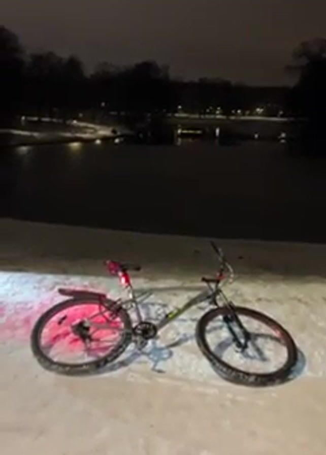 A bicycle stands stationary on a snow-covered path. A faint red light illuminates the rear wheel and the ground behind it. In the background, a dark, frozen lake is partially illuminated by distant city lights. Trees line the distant edge of the lake. The sky is dark and overcast. The scene appears to be at night in a park or similar outdoor location.