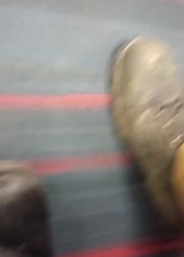 view of a carpet with a horizontal pattern of gray stripes and red lines. A pair of dirty work boots is visible at the start of the video, followed by white tennis shoes. The camera perspective is low, suggesting the video was taken near the ground. The camera moves slightly, shifting the focus on the carpet pattern and the footwear passing by.