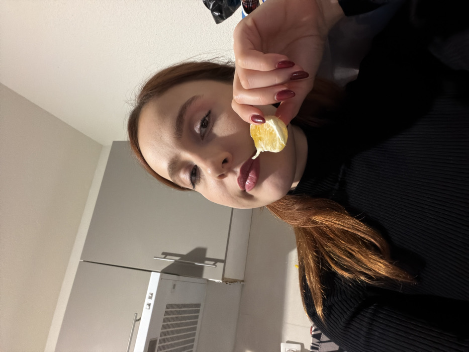 - "A woman with long red hair holds a piece of orange in front of her face" by FM-iVf172, licensed under CC BY 4.0