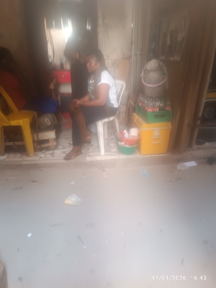 A woman in a white shirt and dark pants sits on a white chair. Next to her are a cooler, a crate of bottled beverages, and a bucket. Another person stands nearby, mostly obscured. A yellow plastic chair is also present. The scene is cluttered, with trash and debris scattered on the ground. The timestamp "17/01/2026 16:43" is visible.