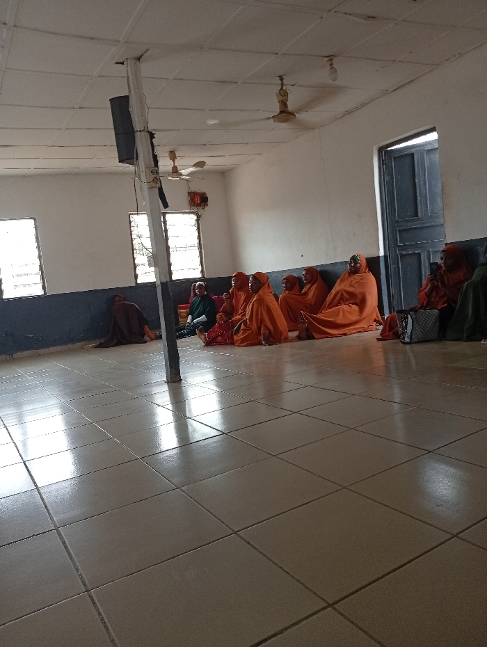 A spacious room with tiled floors and white walls hosts a group of women. Most are clad in orange veils, seated on the floor. Windows allow natural light to illuminate the scene. The ceiling features old-fashioned fans and a speaker system supported by a pole. A blue-gray door stands ajar, adding depth to the composition. The ambiance is calm, with a sense of community.