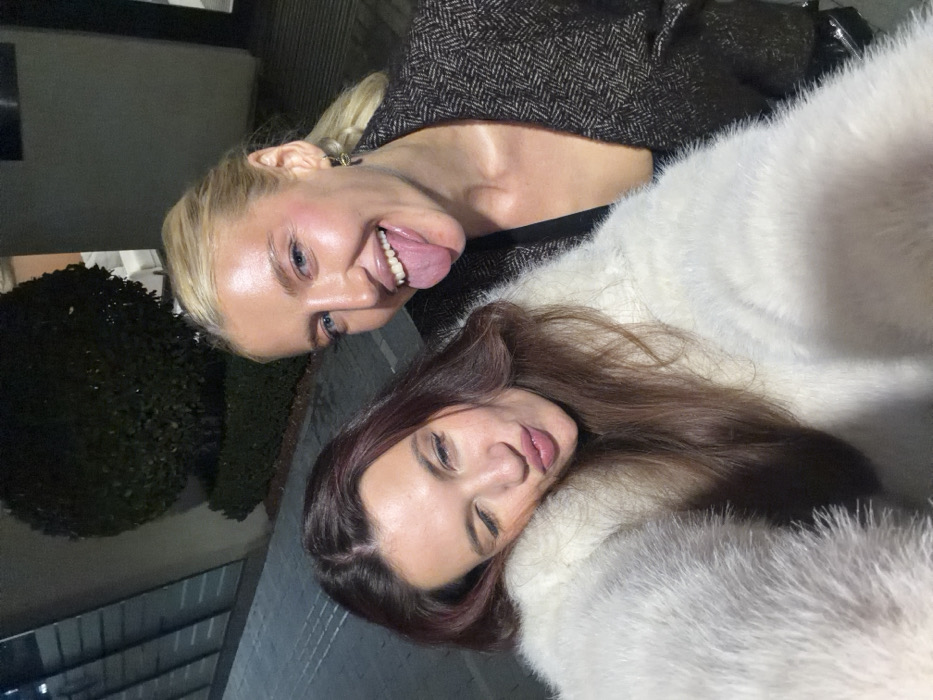 Two women pose for a selfie. One woman with blond hair and blue eyes sticks out her tongue and wears a patterned jacket. The other woman with brown hair wears a fluffy white jacket and looks at the camera with a slight smile. The photograph appears to be taken outdoors at night, with a blurred bush in the background.