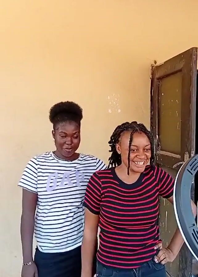 Two young women stand beside each other in front of a pale yellow wall and a partly opened dark door, smiling and looking directly at the camera. The woman on the left wears a white-and-blue striped T-shirt with "GAP" written on it, a black mini-skirt, and has her hair in a high bun. She holds a pair of sunglasses in her left hand. The woman on the right wears a red-and-black striped T-shirt and denim shorts, and has her hair in braids. A circular light stand is positioned slightly in front of her, being held by someone whose head is partially visible in the frame. The women laugh and adjust their poses. The background shows a simple wall and doorway.