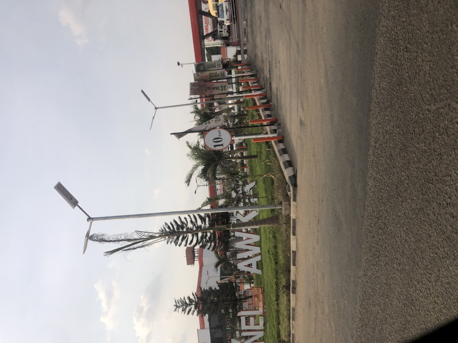 The image captures the entrance area of Stanel World in Awka, Nigeria, under daylight conditions. In the foreground, an asphalt road occupies the lower portion of the frame, bordered on the right by a raised curb painted with black and white stripes. The midground features a landscaped median to the left, containing green grass, several evergreen trees, and palm trees. Large white block letters spelling "STANEL AWKA" are prominently arranged on this grassy median. Two modern streetlights, each equipped with solar panels, are visible on metallic poles. To the right, a line of orange bollards marks an entry lane. Adjacent to these bollards stands a circular white sign with a red border, displaying "10 Km/h". Multiple vertical banners, some featuring "Stanel" branding, are also present along the entry lane. In the background, red-accented commercial buildings, consistent with a petrol station and retail complex, are visible. Several vehicles are partially observable within the complex's entrance, including a yellow bus and a white utility vehicle. The sky above is light blue with scattered white cumulus clouds. No discernible individuals or specific actions are visible in the scene.