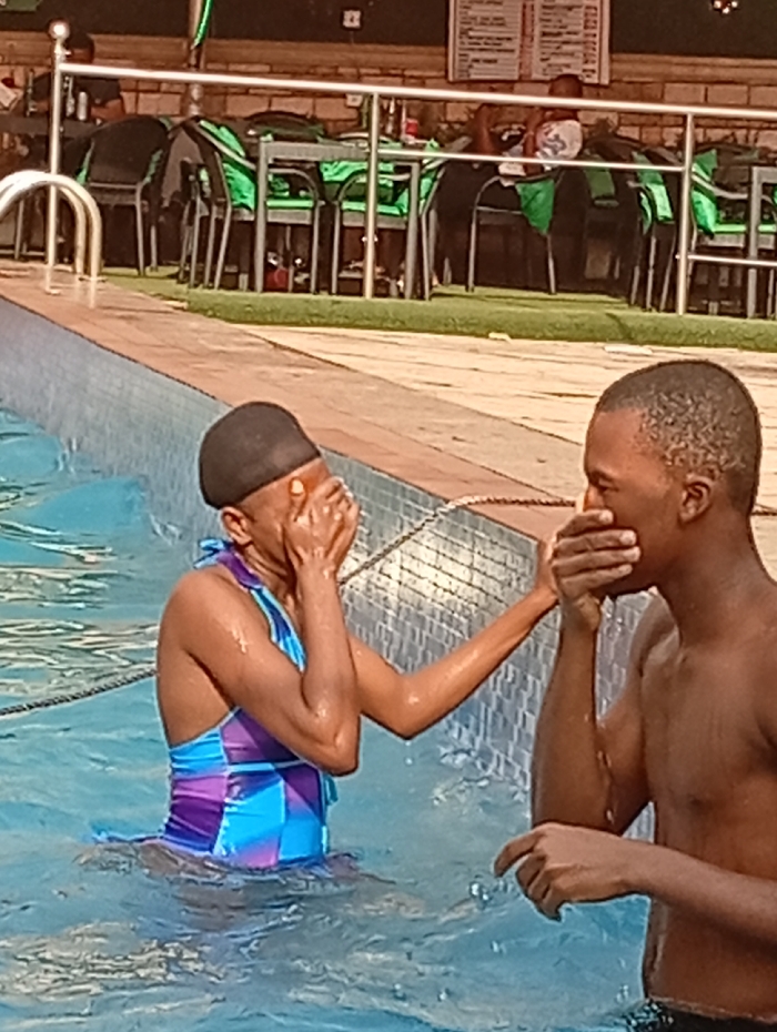 Two people stand waist-deep in a pool. A person in a blue and purple swimsuit and a black swim cap covers their face with their hands. A person to the right of them and slightly in front, bare-chested, also covers their mouth with a hand. Tables and chairs sit in the background, with other people seated in them. The pool is surrounded by a tiled edge.