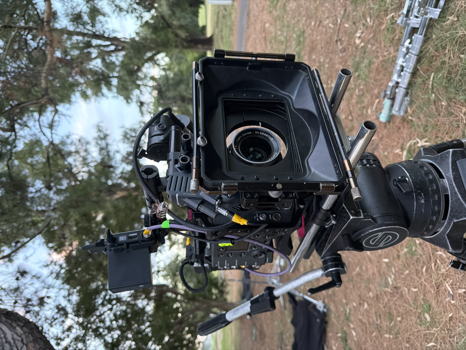 A professional film camera on a tripod is set outdoors. The lens is visible within a matte box. Cables and accessories are attached. The tripod head is black with white lettering. A partially visible, disassembled tripod lies on the ground nearby. Trees are visible in the blurred background, suggesting a park or wooded location. The camera is positioned low to the ground.