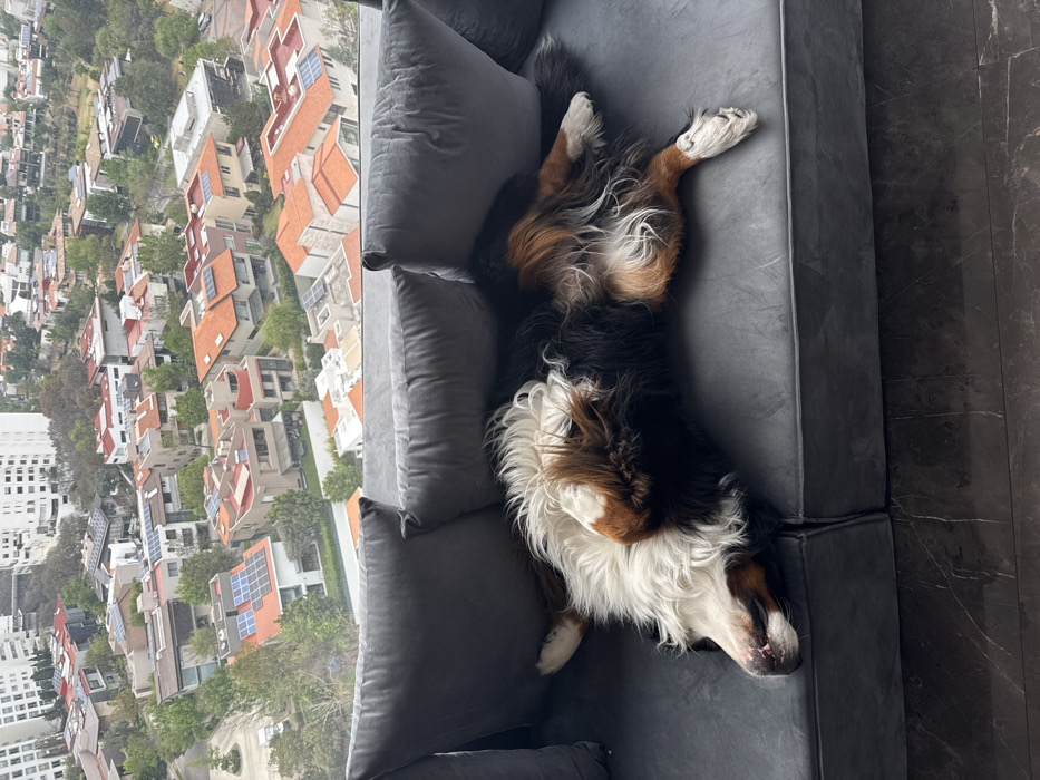 - "A Bernese Mountain Dog lies on its back with its limbs splayed on a two-section gray upholstered sofa" by FM-xGZ4l2, licensed under CC BY 4.0