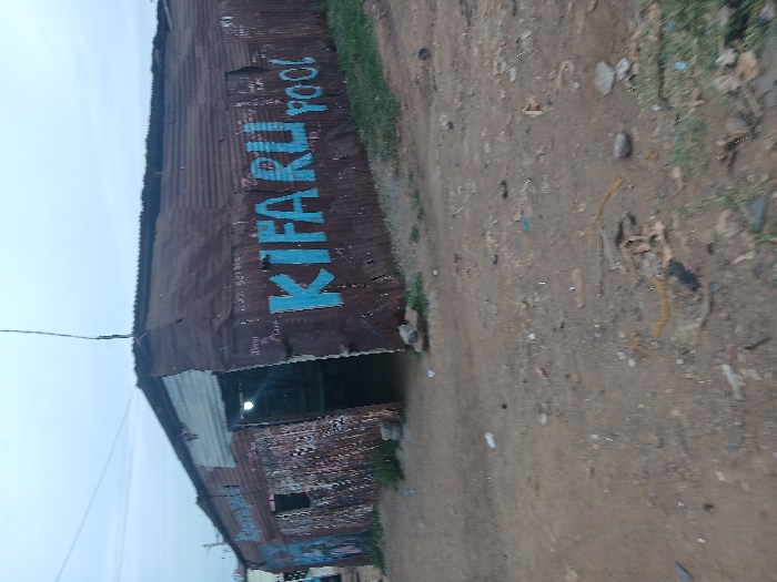 A weathered, corrugated metal building stands on a dirt road. "KIFARU POOL" is painted in faded blue vertically on the side. The road is scattered with debris. The building has an open entryway revealing an interior dimly lit with electric lights. The sky is overcast.