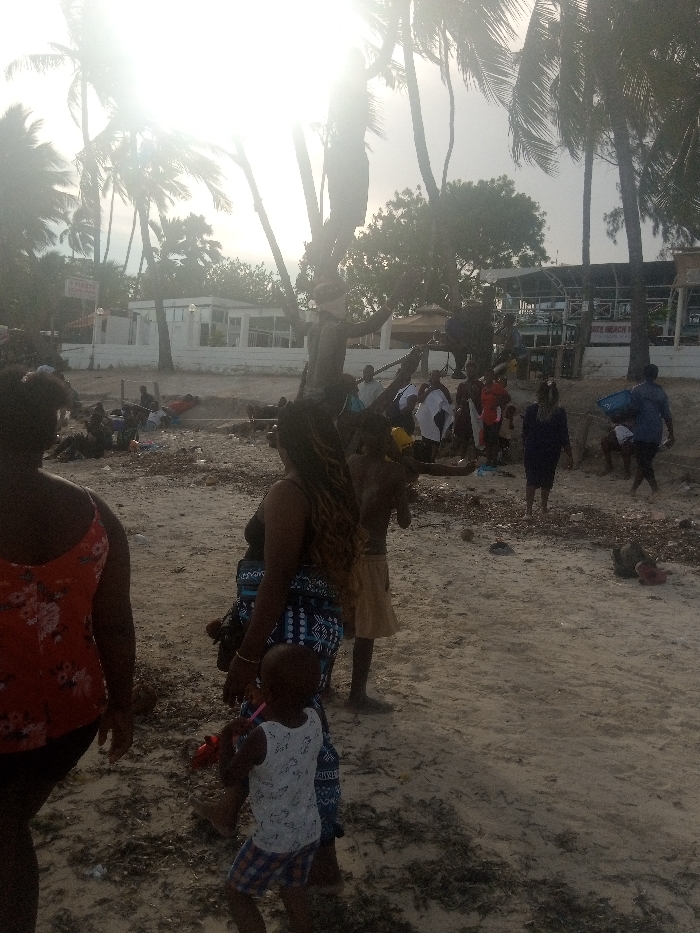The image depicts an outdoor scene on a sandy beach in Shanzu ward, Kenya