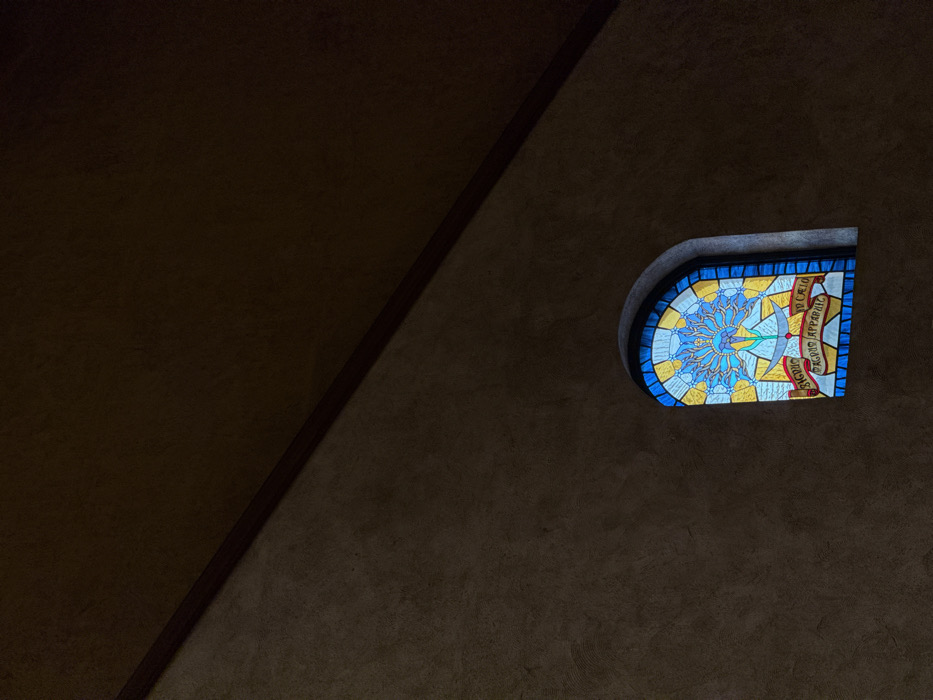 The image depicts the interior of a building, likely a religious structure, in San Pedro Garza García, Mexico. A single, arched stained glass window is positioned in the lower right quadrant of the frame, illuminating a dark brown, textured wall. The window features a central stylized blue and light blue floral or starburst motif, encircled by yellow and blue geometric patterns. Below this, a white sword-like object points downwards, flanked by two red banners. The left banner displays the Latin text "SIGRIS" and "SAGRIS," while the right banner shows "IN COELIO" and "APPARUIT." The wall exhibits a rough, stucco-like finish. Above the wall, a darker brown, textured ceiling slopes diagonally downwards from the upper left to the lower right, separated by a thin, dark brown beam. No individuals or discernible actions are present in the scene. The overall lighting is dim, with the stained glass window acting as the primary light source.