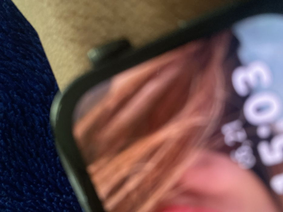 The scene is located in Lom, Bulgaria. The image presents an extremely blurred, close-up, angled view of a digital device screen, likely a smartwatch or smartphone. The device features a dark-colored casing with a discernible button or dial visible on its right edge. The screen displays bright digital numbers, prominently showing "5:03", with smaller, less clear numbers, possibly "26.24", positioned above it. Across the screen, multiple wavy, parallel strands of light reddish-brown hair are reflected. A blurred pink or red object, consistent with a fingernail or part of a finger, is partially visible on the far left foreground. The immediate background includes a dark blue, textured fabric on the upper left and a light brown, textured surface, possibly skin, to the right of the device. No specific individuals, active interactions, or broader environmental details are discernible due to the significant lack of focus.
