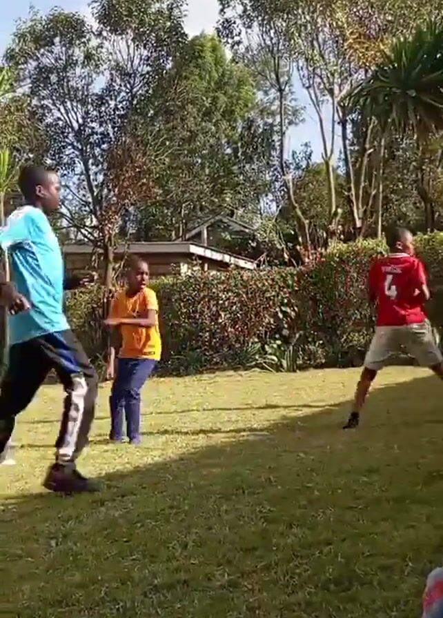 Several young children are playing tag in a grassy, outdoor yard. The yard is bordered by trees and a tall hedge. The sky is partly cloudy. The children are wearing various casual clothes, including t-shirts and pants. They are running and laughing as they play.