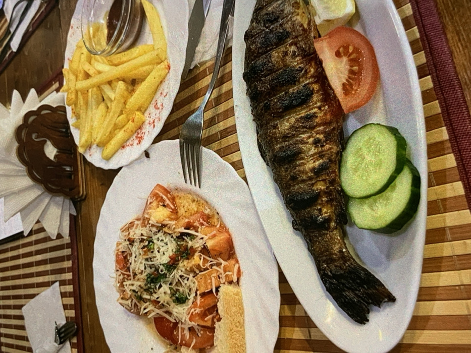 The image displays a meal arranged on a table within an indoor dining establishment in Chaikovsky, Russia. The table surface is covered by a striped place mat, featuring alternating light and dark brown bands. In the foreground, a whole, grilled fish with char marks is served on a white oval plate, accompanied by two circular cucumber slices, one red tomato wedge, and one yellow lemon wedge. To the left, a white plate holds a dish composed of diced red tomatoes topped with shredded white cheese and green herbs, with two small pieces of bread visible underneath. To the right, a white plate contains a portion of golden french fries, with red seasoning sprinkled on the plate's edge, alongside a small, clear glass ramekin filled with a dark red sauce. A silver four-tine fork rests between the fish and tomato dishes, with a silver knife partially visible to its right. In the upper background, a wooden napkin holder featuring a cut-out design of a flamingo holds several white paper napkins. No individuals are visible in the scene.