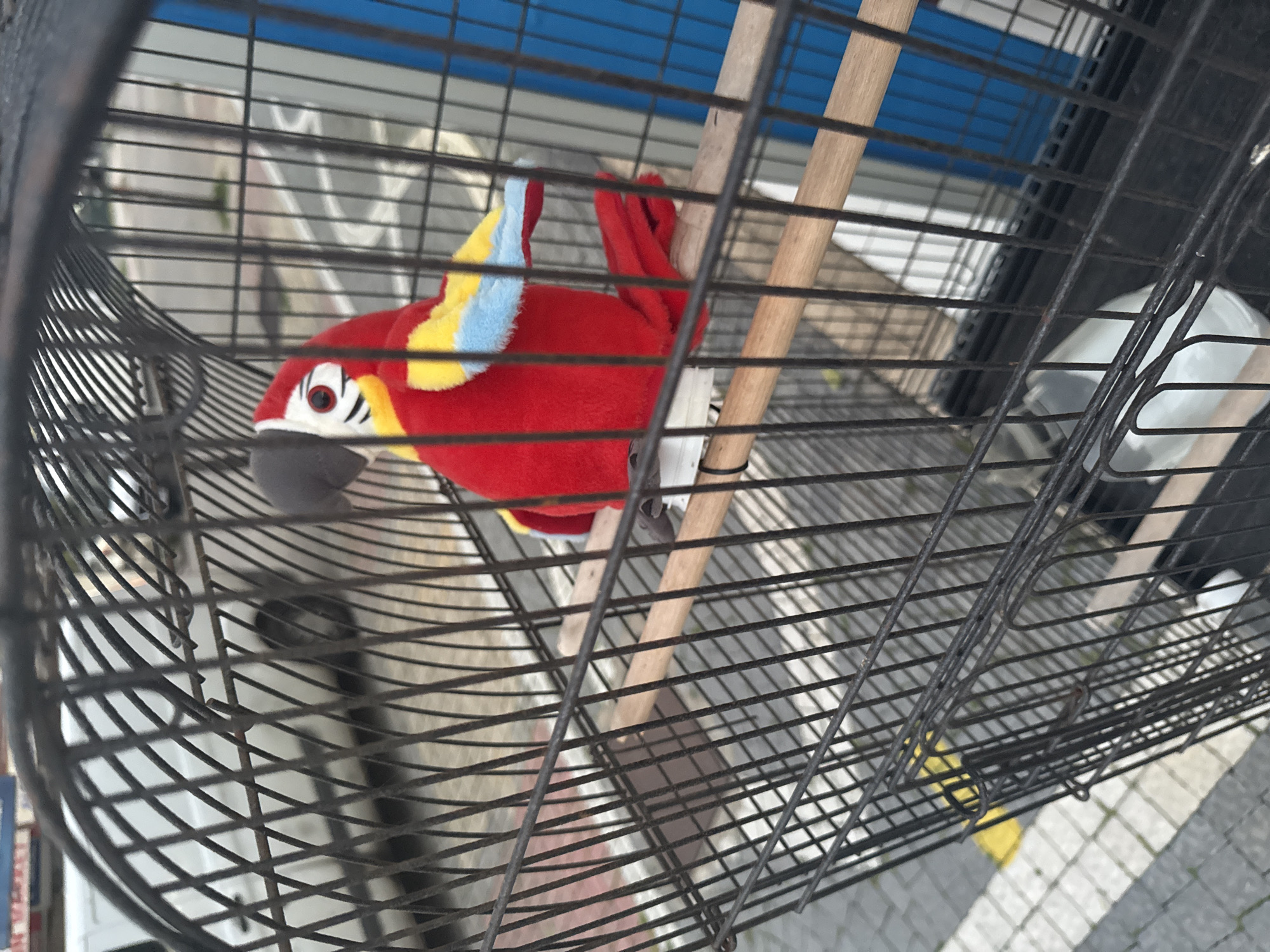 - "A stuffed red parrot sits on a wooden perch inside a black wire cage" by FM-tiOZv1, licensed under CC BY 4.0