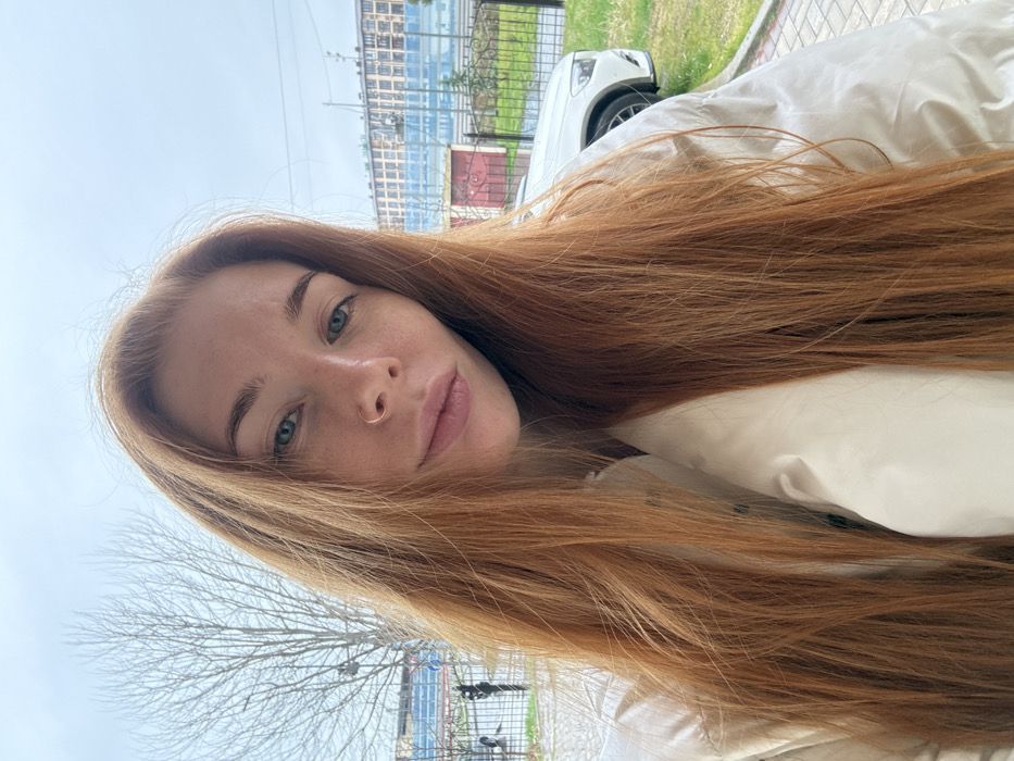 The image displays a young adult female with long, reddish-brown hair, light blue-green eyes, and visible freckles, wearing a light-colored, possibly beige, padded jacket