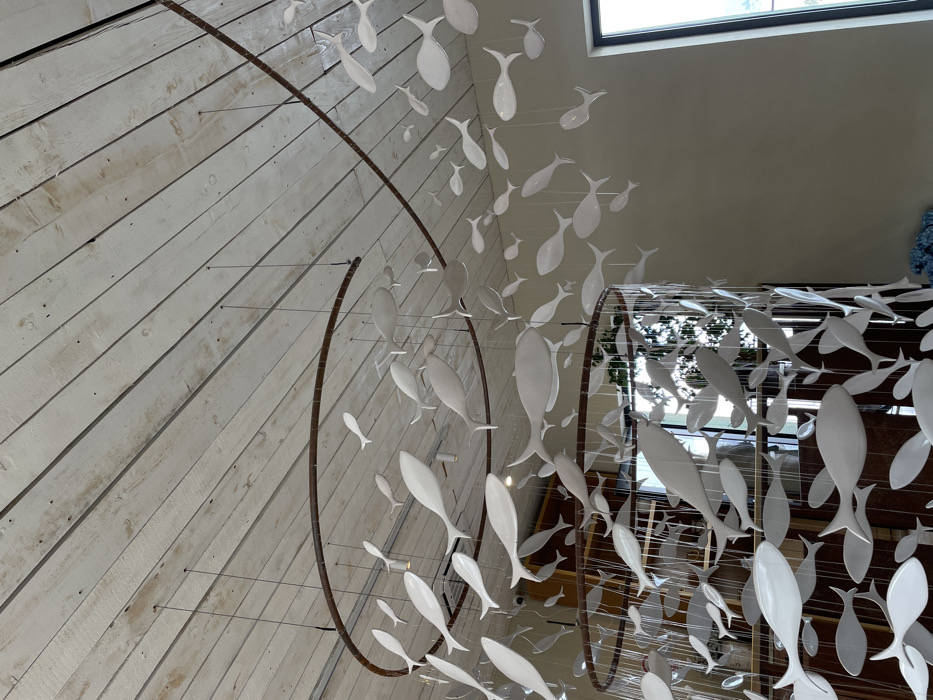 The image displays an interior space located in Tsamakaberd, Armenia. The ceiling is constructed from light-toned wooden planks, exhibiting visible grain and minor imperfections, oriented horizontally across the frame. Dominating the upper and central portions of the scene is a multi-tiered art installation featuring numerous opaque white fish figures. These stylized fish, varying in size, are suspended by thin wires from a dark, spiral-shaped metal framework and directly from the ceiling, creating the illusion of a flowing school. A lower, cylindrical section of the installation, also populated with white fish, is partially visible in the bottom-left and center. To the right, a plain, light beige wall is visible, with a dark-framed window on the far right revealing a glimpse of green foliage outside. No individuals are present in the scene.