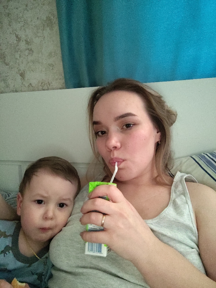 An adult female and a young child are positioned together in an indoor setting, identified as the city of Марковский, Russia. The female, with light brown hair and wearing a light grey ribbed tank top, is centrally featured, drinking from a small green and white juice box with a white straw. A plain gold-colored ring is visible on her left ring finger. Her lips are pursed around the straw, and she looks directly towards the camera. To her left, partially visible, is a young child, approximately 2-4 years old, wearing a blue t-shirt with a dinosaur print and a thin gold-colored chain around his neck. The child also looks towards the camera with a neutral expression, and a piece of light-colored food is visible in his left hand. Both individuals appear to be seated or lying against a white headboard or backrest. The background consists of a textured, light-colored wallpaper on the left and a bright teal/turquoise curtain or fabric on the right. A striped pillow is partially visible on the far right.