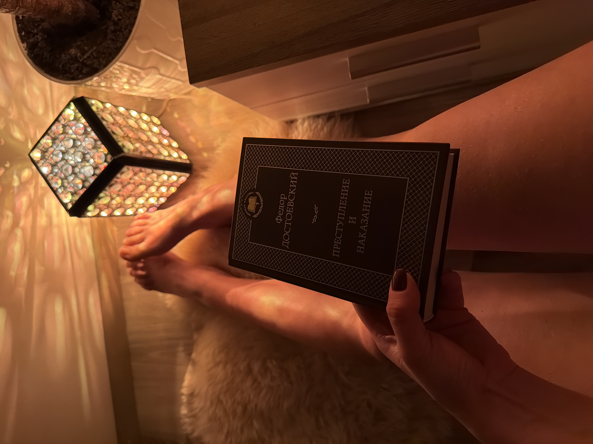 An indoor, close-up shot shows a person sitting on a soft, furry surface, seemingly a rug. The person is holding a book in their right hand; the book has a dark cover with text in Cyrillic script, identifiable as "Преступление и наказание" by Fyodor Dostoevsky. Their leg rests on the rug. The surrounding environment is warmly lit by a cube-shaped lamp sitting on the rug on the left, next to a potted plant. The top of a bedside table is visible above the leg. The location is suggested to be in Dreiliņi, Latvia, though specific contextual details connecting the scene to this location are not visible in the image. No specific actions, interactions, or other people are visible.