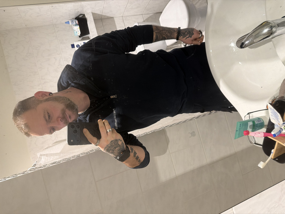 A person with tattoos and a beard stands in a bathroom, taking a mirror selfie with a smartphone. The person is wearing a dark-colored, zip-up hooded sweatshirt and dark pants. A white sink and faucet are visible, alongside a toothbrush holder with toothbrushes and toothpaste. A white toilet is in the background. The bathroom has white tiles.