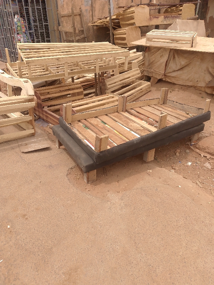 This image captures an outdoor carpentry workshop or furniture sales display in Jos, Nigeria. The scene is dominated by unfinished wooden furniture frames, presented under natural daylight. In the immediate foreground, a rectangular wooden frame, possibly a bed base or sofa frame, rests on short wooden legs. Its top surface consists of horizontal wooden slats. A dark-colored, possibly black, padded or upholstered border runs along its front and right edges. The ground beneath this frame is reddish-brown dirt, transitioning to a granular, reddish-brown paved surface in the foreground. In the midground, directly behind the prominent frame, a smaller, elevated rectangular wooden frame with horizontal slats, resembling a bench or table top, is visible. To the left, a distinct curved wooden armrest section of a sofa or chair frame is present. Numerous other light-colored wooden components, including disassembled or partially assembled furniture frames (such as backrests and seat bases), are stacked or scattered across the unpaved ground. The background features a light-brown, unpainted building wall. Against this wall, various stacks of raw timber planks and wooden panels are visible. On the far left, a metal grille or gate partially obscures colorful items behind it, suggesting a storage or retail area. To the right of the stacked timber, a light-colored tarp or fabric covers an unseen object. No individuals, actions, or direct interactions are depicted.