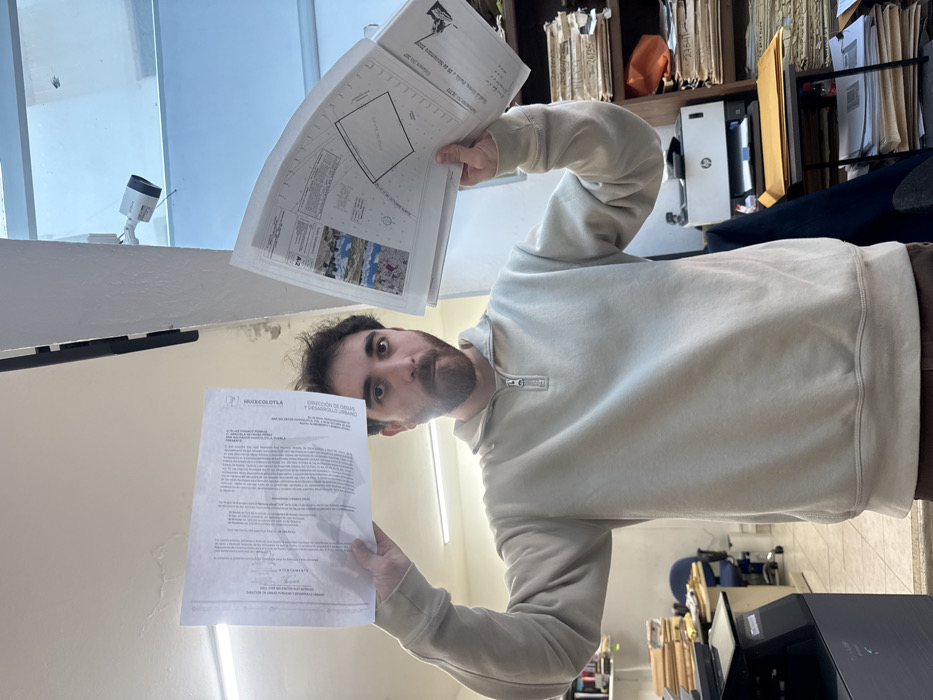 A man wearing a light-colored sweatshirt holds two pieces of paper. The paper in his left hand has text and a logo, and the paper in his right hand appears to be a map with drawings. A security camera is mounted on the wall near the ceiling. Shelves with file folders and a printer are visible in the background, next to office supplies. The man has dark hair and a beard.