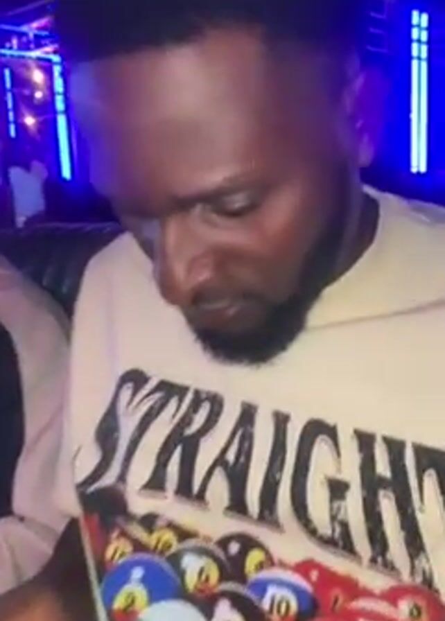 two men in a dimly lit, crowded club or lounge setting. The first man wears a light-colored sweatshirt with the word "STRAIGHT" and a pool ball design on it. He looks down, seemingly focused on something in his lap or on a table. He glances up at the camera briefly. The second man sits next to him, wearing a black jacket, a black baseball cap, and sunglasses. The club has a modern design with metal structures and blue lighting visible in the background. The music is audible. The overall mood appears casual.