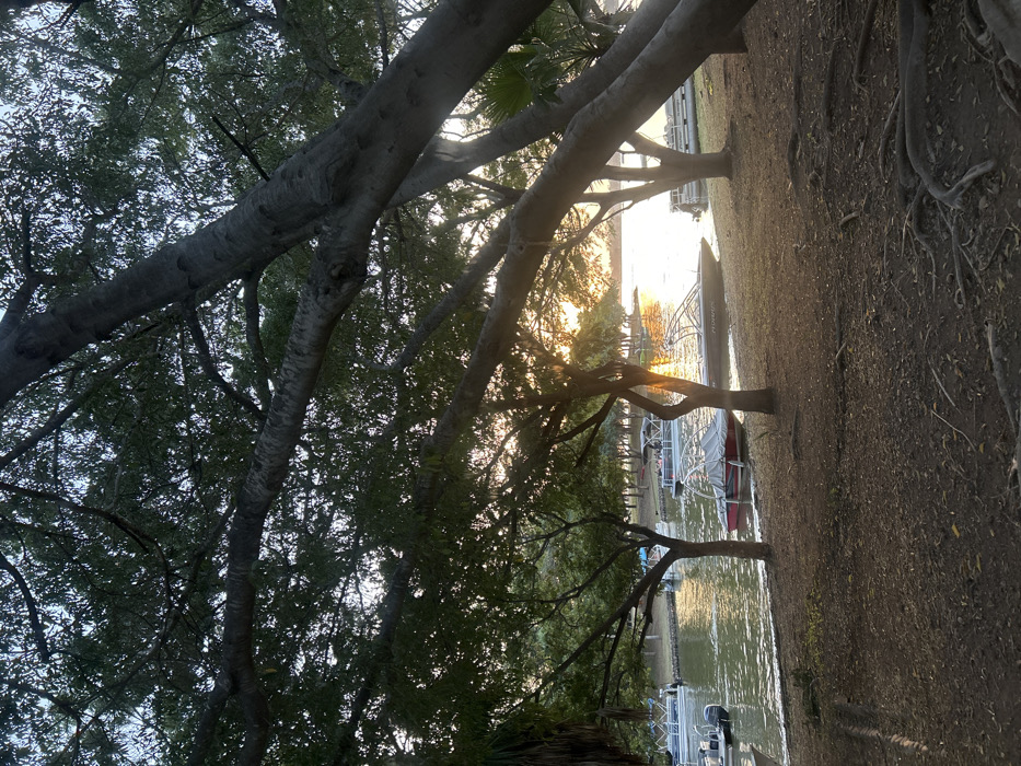 A serene waterside scene features a row of boats along a calm lake. The sun shines brightly through the leaves and branches of tall trees framing the view, creating a dappled light effect. A strip of dirt or soil is visible along the water's edge, with exposed tree roots adding texture. The overall ambiance is peaceful and natural.