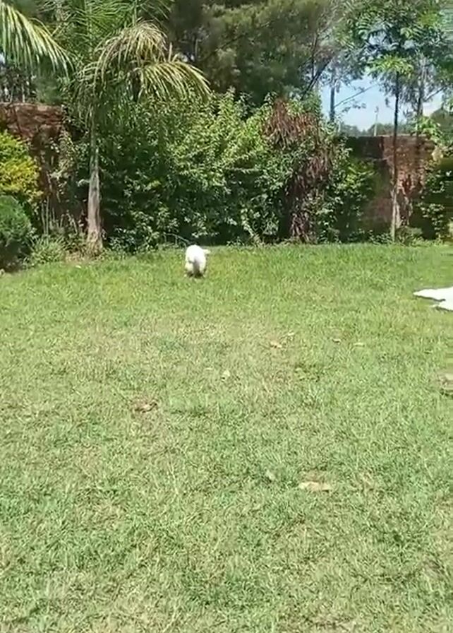 A white dog is running across a grassy lawn towards the camera. Behind the dog is a brick wall and a variety of trees and bushes. The camera is stationary.