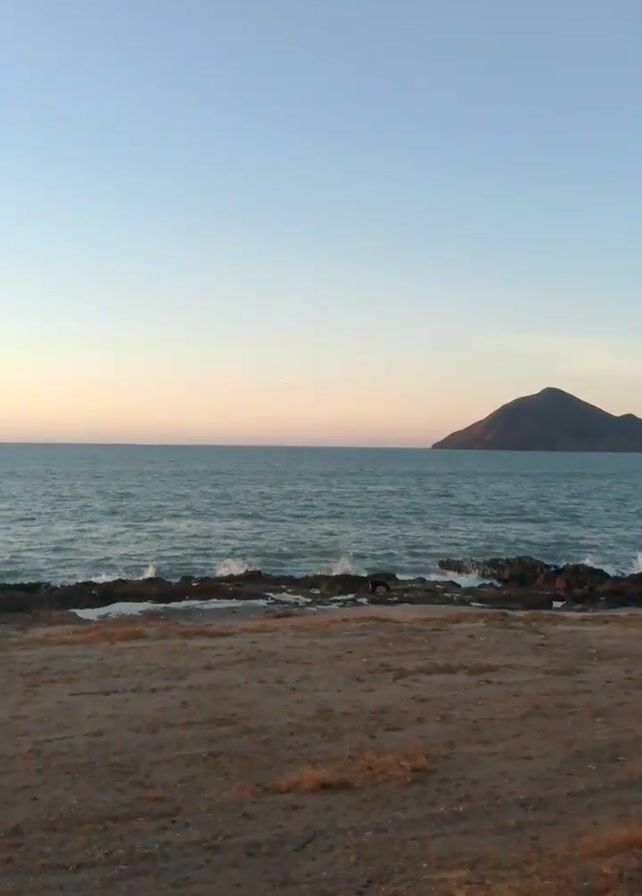 coastal scene with a beach in the foreground, the ocean in the middle ground, and a mountainous island in the background. The sky is light blue with hints of peach and orange near the horizon. Gentle waves are crashing against a rocky shoreline. A young girl briefly walks into frame on the right side of the screen. The beach has dry, sandy soil. The camera is stable.