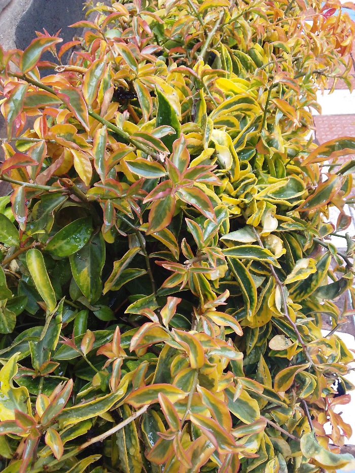 A lush plant with variegated leaves dominates the scene. Leaves are primarily green and yellow, exhibiting varied patterns: some green with yellow edges, others yellow with green edges. Newer growth displays reddish tinges. Water droplets are visible on the foliage, suggesting recent rain or dew. The plant's density and close-up perspective highlight its intricate leaf patterns and textures.