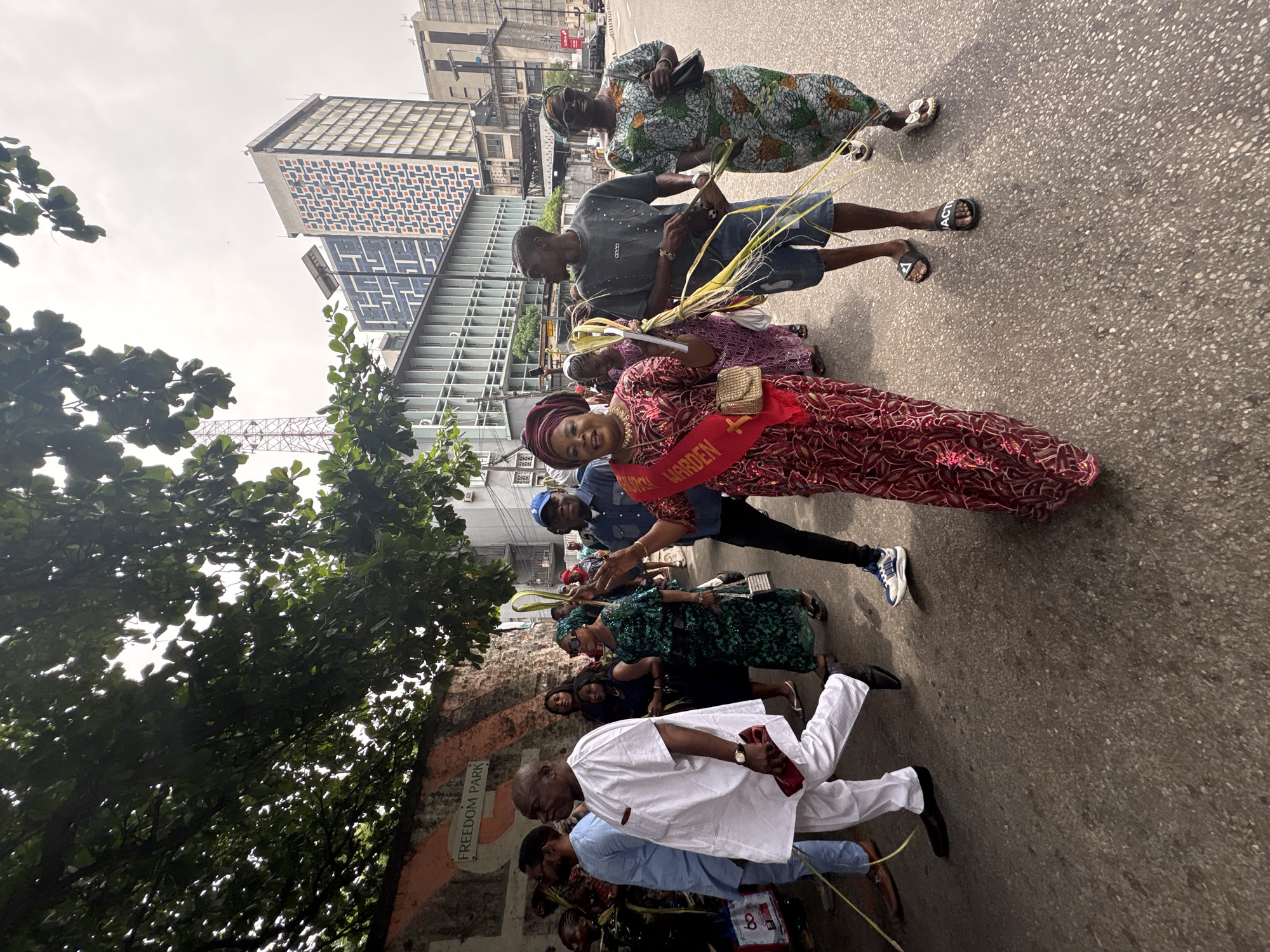 A street-level shot depicts a group of people walking on an asphalt road in Lagos, Nigeria. A woman in a red, patterned dress and a sash labeled "WARDEN" is in the foreground. Several other people walk behind her, holding what appear to be palm fronds. Clothing styles vary, with some wearing traditional African attire and others in casual clothing. The setting includes urban elements, with modern buildings visible in the background, one featuring a patterned facade. A tree partially obscures a wall labeled "FREEDOM PARK." The sky is overcast. The scene suggests a Palm Sunday procession or a similar religious celebration.