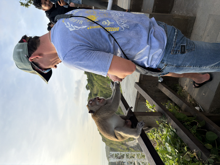 An outdoor scene in Bunga Mekar, Indonesia, depicts a close interaction between an adult male and a macaque monkey at a cliffside viewpoint
