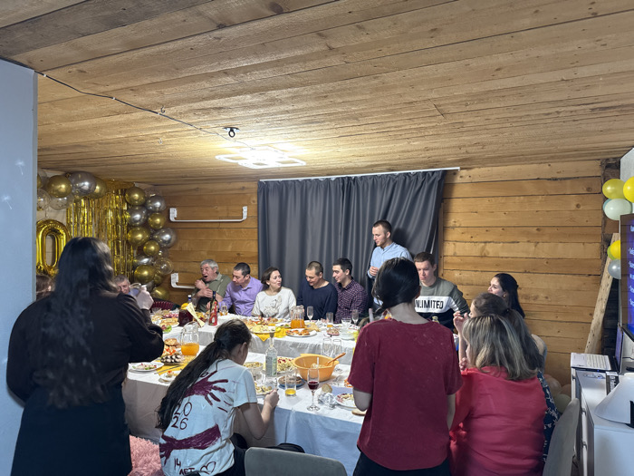 A group of people are gathered around a long table laden with food and drinks. Some are seated and eating, while others stand and appear to be conversing. Decorations, including balloons and streamers, adorn the space, suggesting a celebration. The interior has a rustic feel with wood-paneled walls and ceiling. The lighting is bright, and the atmosphere seems cheerful and convivial.