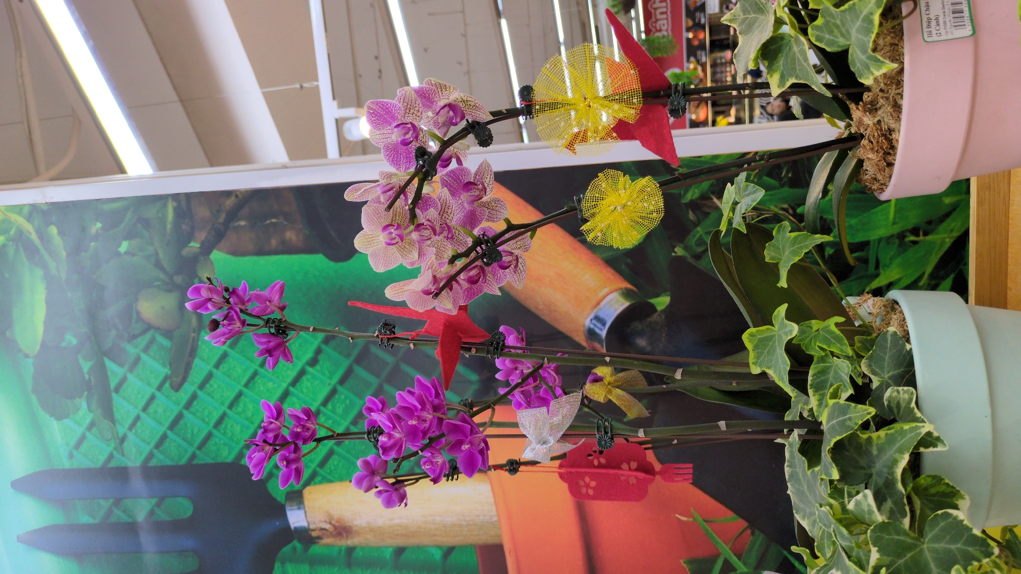 two potted plants with orchid blooms and ivy, set against a backdrop featuring gardening tools