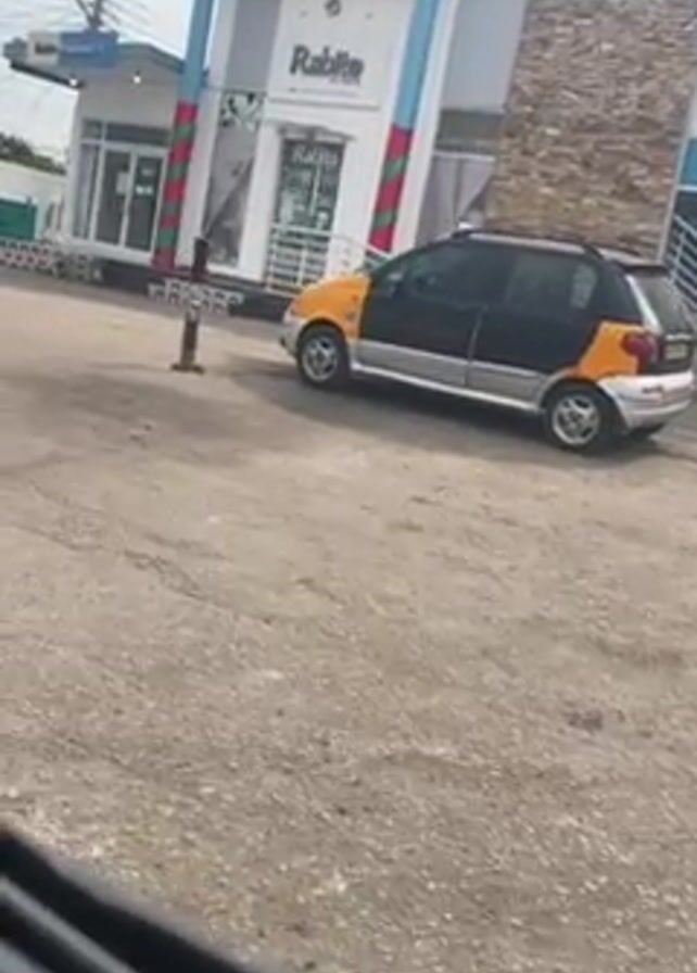 view from inside a moving vehicle driving past a Rabito Pharmacy. The pharmacy building is painted in blue and white, with the word "Rabito" visible on the facade. A parked taxi, painted yellow and black, is also visible next to the building. Several people are walking along the sidewalk. The ground is paved. Powerlines are seen above.