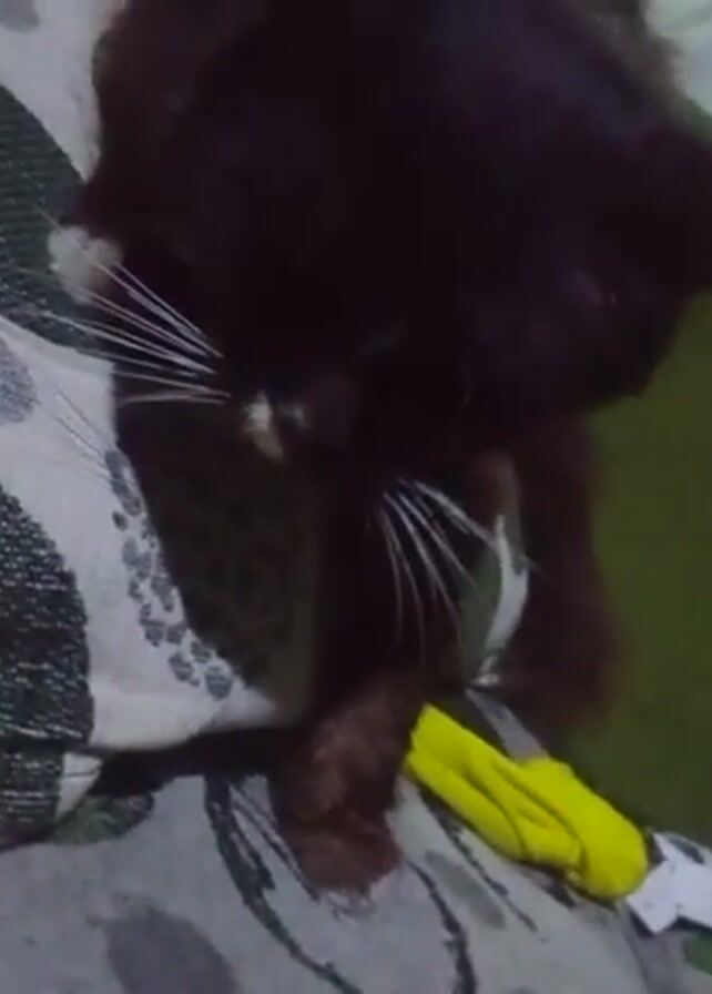 The video presents an overhead shot of a black cat lying on a pillow with a patterned cover. A yellow object and a small box are placed near the cat on the pillow. A green mat is visible to the left, and there are strands of fringe near the right edge of the shot. The cat's face is close to the camera, showing its whiskers.