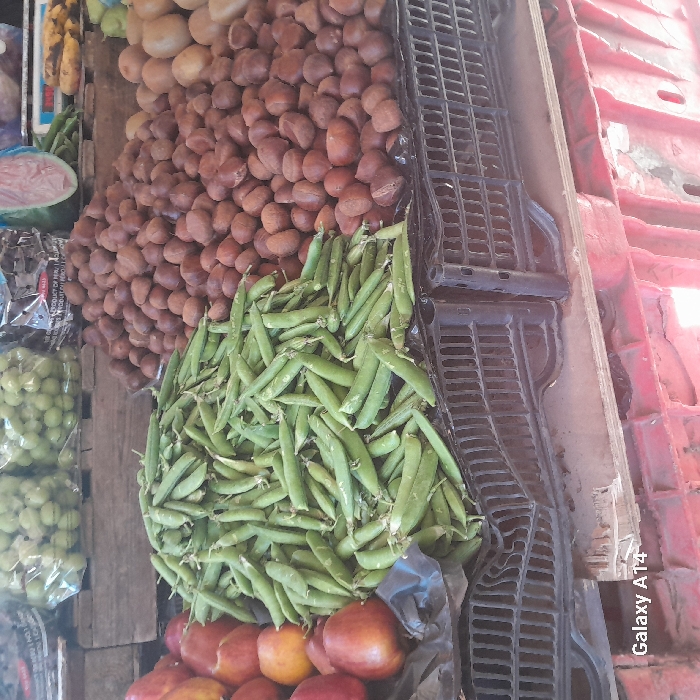 This image captures a market stall displaying various fresh produce in Deir el-Balah, Palestinian Territory. The foreground features three large piles of produce arranged in black plastic crates. A substantial mound of fresh green pea pods occupies the center. To the left, a pile of red-skinned fruits, resembling apples, is visible. To the right, a large quantity of brown, rounded nuts, consistent with chestnuts, is stacked. In the background, additional produce is displayed on wooden planks and atop red crates. These include clear plastic bags filled with green grapes, a black bag containing dark-colored produce (possibly dried fruit), and a section displaying kiwis. A slice of watermelon and green beans are also visible, along with a portion of a weighing scale. No people are present in the frame. The scene is brightly lit, indicative of a daytime market environment. The image contains a "Galaxy A14" watermark in the bottom left corner.