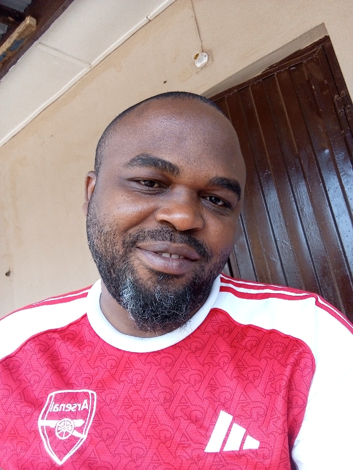 An adult male subject is depicted in a close-up, frontal selfie, located in Sabon Tasha, Nigeria