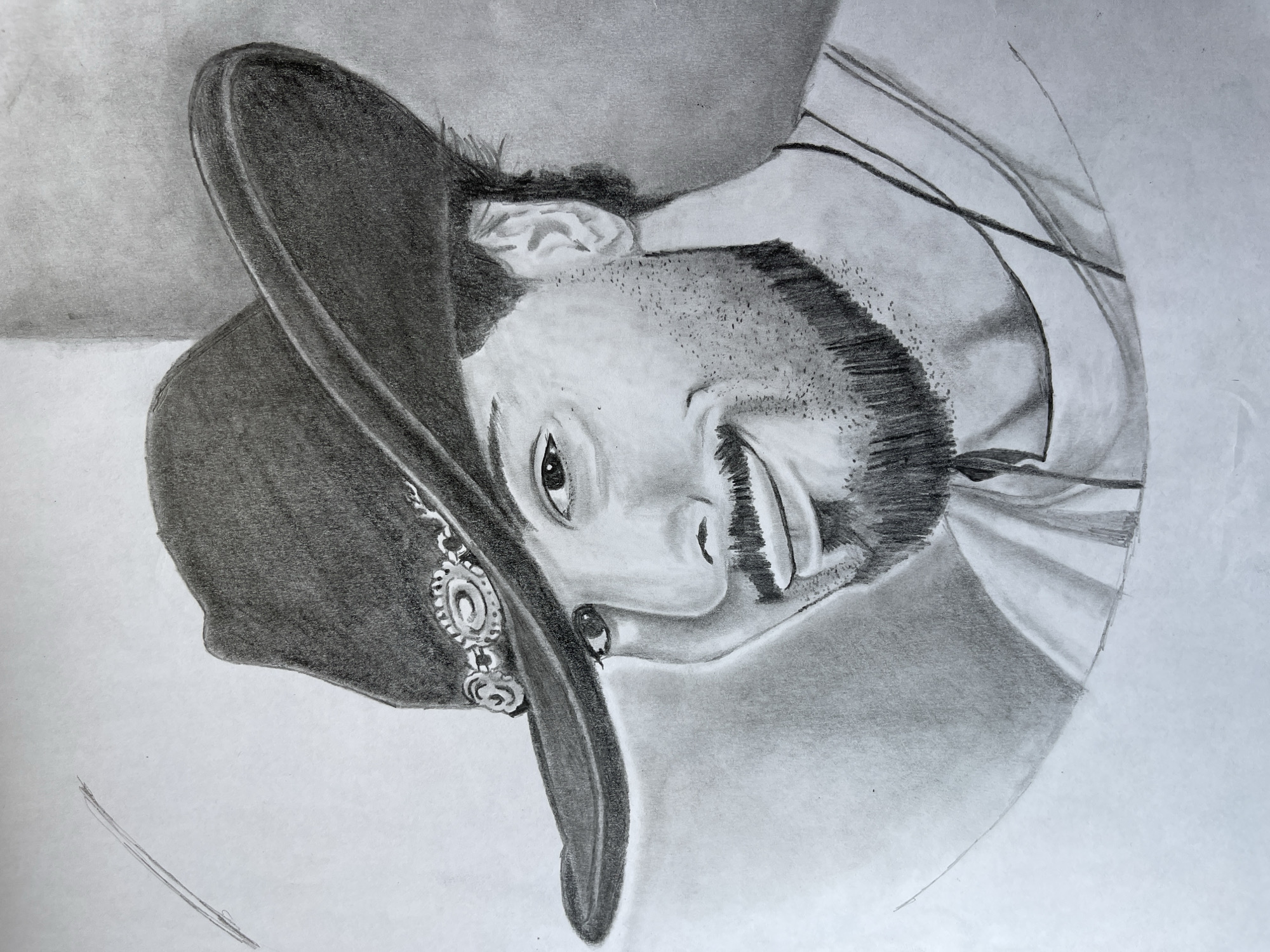 A pencil drawing depicts a man wearing a cowboy hat