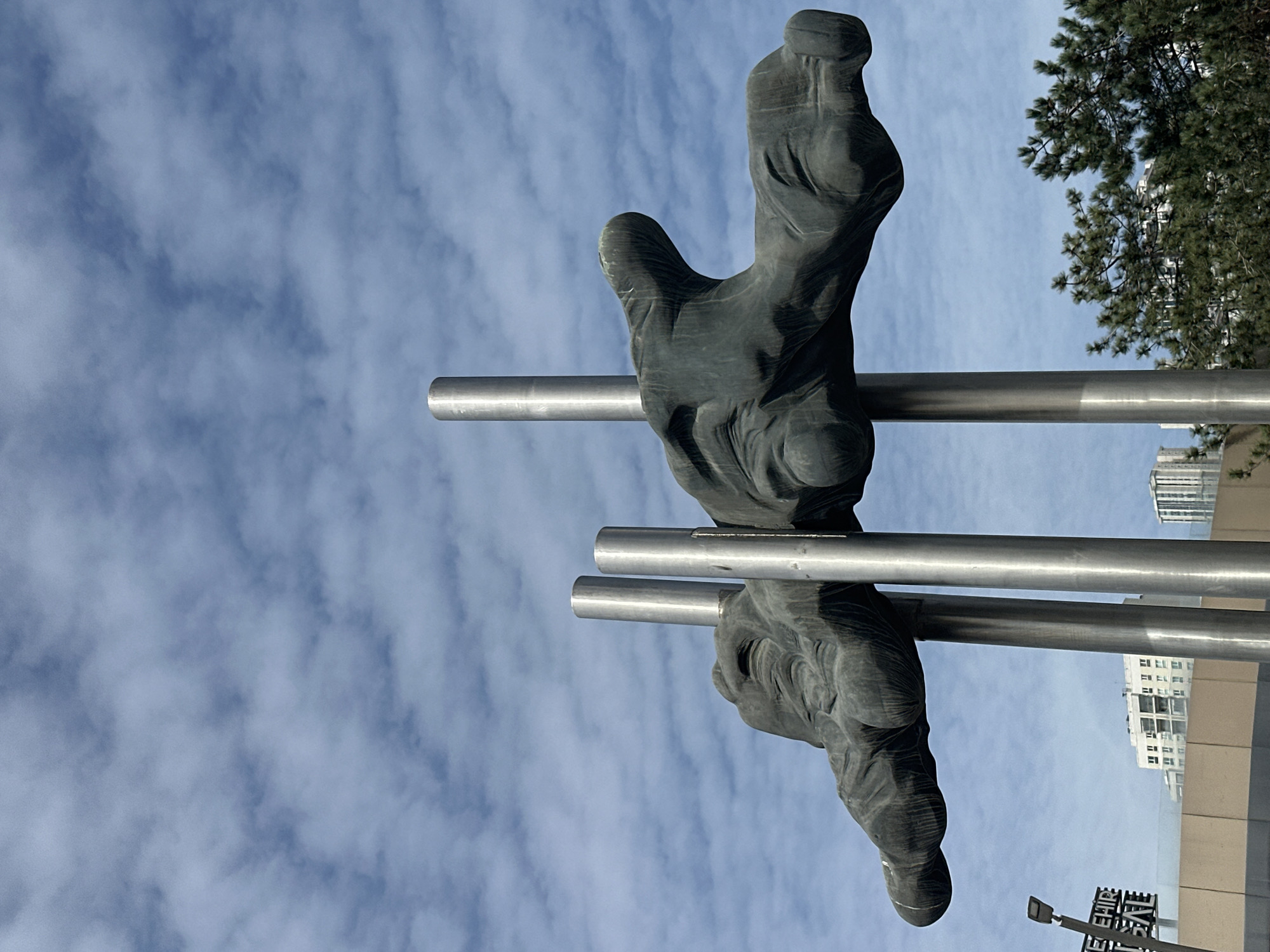 A low-angle shot captures a sculpture of two mirrored hands holding two parallel bars, likely made of metal