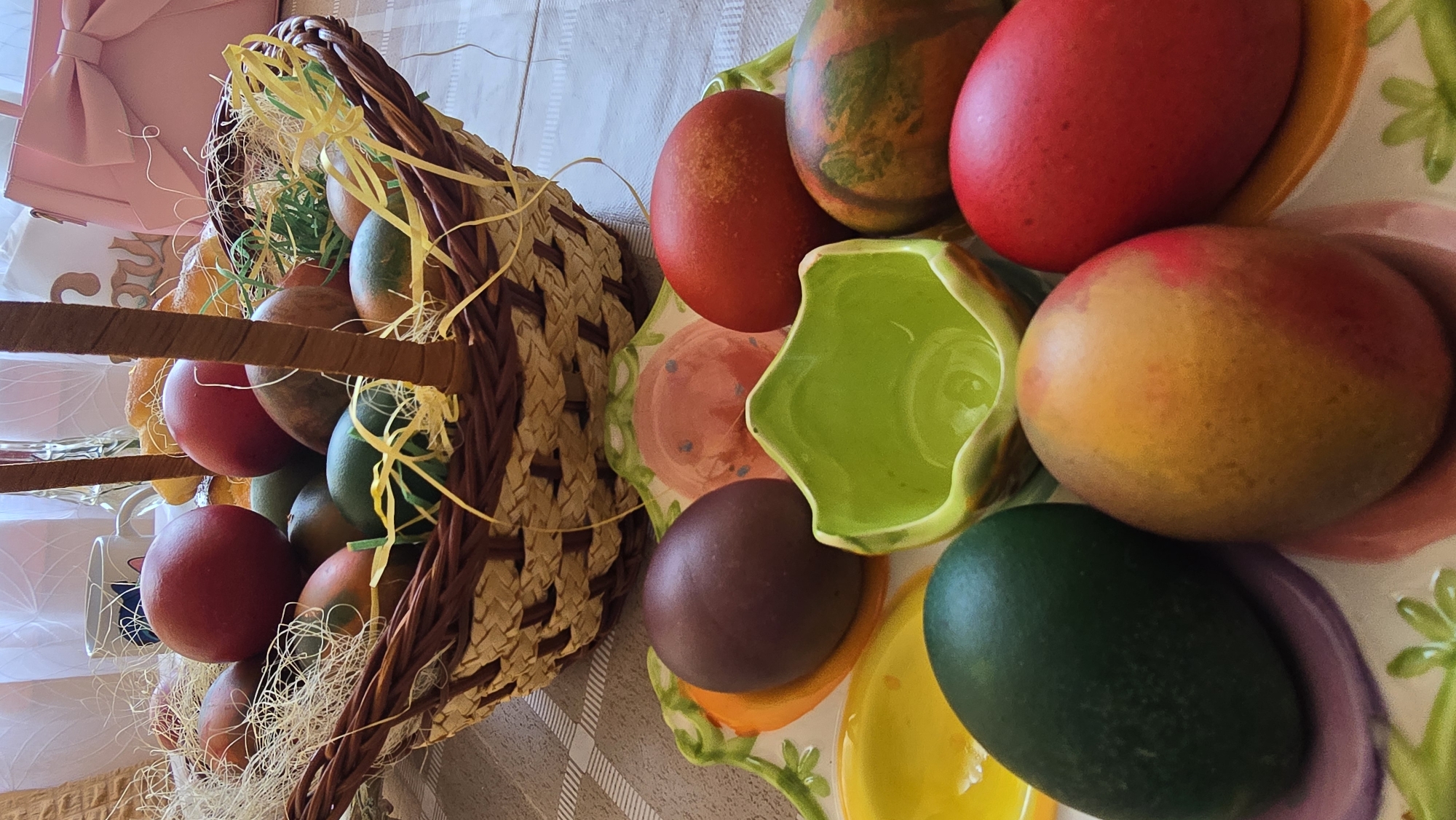 basket overflowing with Easter eggs and straw. A plate with more Easter eggs and a green ceramic container is on the right. The eggs are dyed in various colors, including red, orange, green, brown, and yellow. The environment appears to be indoors, likely a home. The exact location in Levski, Bulgaria, cannot be determined from the image.