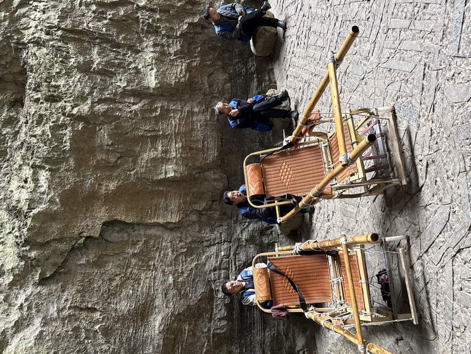 This image depicts a scene within a natural geological formation in Wulong District, China, characterized by a towering, deeply striated grey and brown rock face forming the background. The ground is paved with irregular, flat grey stones. In the foreground, two traditional Chinese sedan chairs are positioned, facing slightly towards the viewer. Each chair features a woven light-brown rattan seat and back, a brown padded headrest, and an exposed wooden frame with prominent bamboo carrying poles extending front and rear. Black safety straps are visible on the chairs, and a dark red cloth hangs over the back of the left chair. Behind the sedan chairs, four East Asian males are observed resting. From left to right: 1. A man in a light-colored jacket over a blue vest is seated on a low rock or stone block, looking towards the left. 2. A second man, wearing a dark jacket and a blue vest, is seated on a low rock or stone block, with his mouth open, appearing to speak. 3. A third man, also in a dark jacket and a blue vest, is seated on a low rock or stone block, with his hands clasped in front of him, looking downwards. 4. A fourth man, dressed in a dark jacket and a blue vest, is seated on a low rock or stone block on the far right, actively looking down at a smartphone held in his hands. The men appear to be porters for the sedan chairs, which are currently unoccupied, indicating a pause in activity within a tourist area.