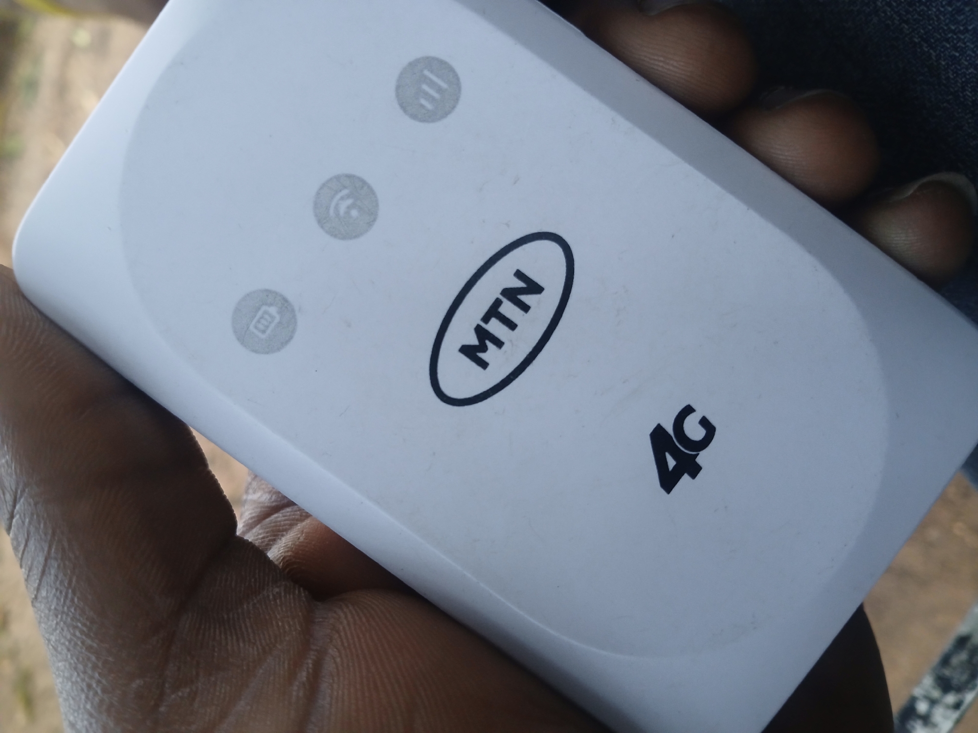 A white MTN 4G portable Wi-Fi hotspot device is held by a person with dark-skinned fingers and thumb in the city of Unknown, Unknown. The device, positioned diagonally, displays the "MTN" logo within an oval, "4G" in bold black text, and three circular grey icons representing battery, Wi-Fi, and cellular signal strength. The person's fingers grip the device from the left and lower right, with blue denim fabric visible beneath. The background is an out-of-focus outdoor setting with brown and hints of green tones, suggesting natural ground or vegetation under ambient light.