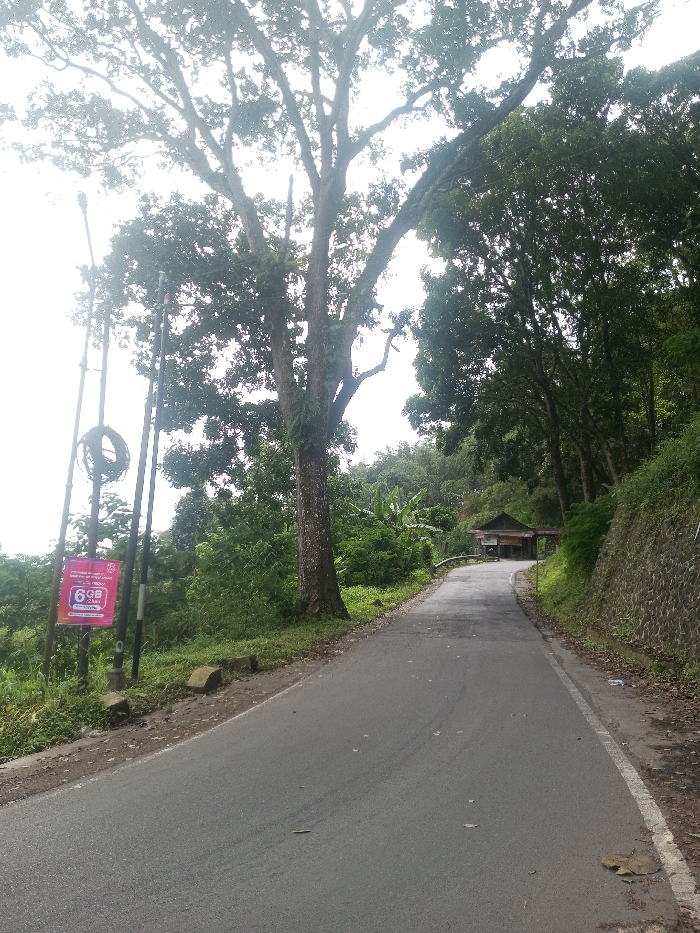 A winding asphalt road stretches into the distance, flanked by lush greenery and tall trees. A building is nestled amongst the trees in the distance. On the roadside, a pink advertisement is affixed to a utility pole, along with a coil of dark wire. A retaining wall constructed of light gray blocks runs along the edge of the road. The sky is overcast and bright.