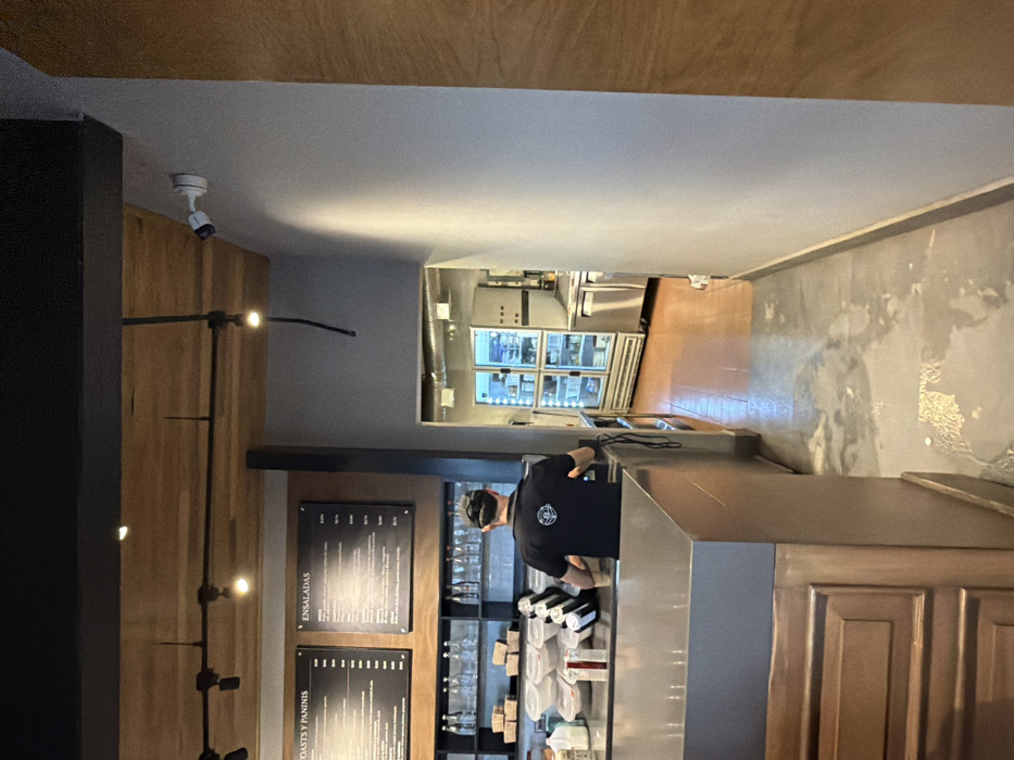 This image captures the interior of a commercial food establishment located in Fraccionamiento Los Heroes Queretaro, Mexico. The perspective is directed towards a service counter area and an open doorway leading to a rear kitchen or prep area. In the foreground, a male individual is standing with his back to the camera, positioned behind a dark grey countertop. He wears a black short-sleeved uniform shirt featuring a white logo on the back and a black baseball cap. His hands are engaged over the counter. Behind the individual, two rectangular black menu boards with white text are mounted on a light grey wall; visible titles include "TOASTS Y PANINIS" and "ENSALADAS." Below the menus, a dark shelving unit holds numerous clear bottles and white plastic containers. The service counter itself has a dark grey top, with a wooden paneled base and a metallic grey upper section. The immediate floor in the foreground is light grey concrete with irregular white splatter marks. The ceiling above the counter is constructed of wooden slats, fitted with a black track lighting system containing multiple spotlights. A white dome-style security camera is mounted on the light grey wall in the upper right portion of the image, angled towards the front. A black cable segment hangs from the ceiling/wall just below the track lighting. Through the open doorway, a brightly lit back area is visible, revealing commercial kitchen equipment. This includes at least two tall, multi-door refrigerators with glass fronts, stocked with various food items in containers. Several stainless steel surfaces, likely counters or appliances, are also present. The floor in this rear section is a reddish-brown tile. Metallic ventilation ductwork is partially visible near the ceiling of the back area.