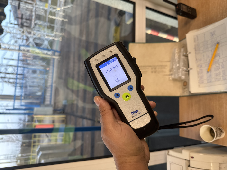 The image depicts an interior scene, likely a control room or office, overlooking an electrical substation in Obruchishte, Bulgaria. A human hand, with light skin tone, holds a Dräger Alcotest 7510 breathalyzer device in the foreground. The device, black and silver, displays "ГОТОВО" (READY) in Cyrillic, along with "0 min" and "2472" on its screen. A black lanyard is attached to the device. On a light-colored wooden desk beneath the hand, an arrangement of objects is present: a white paper cup containing dark residue, an open ring binder with handwritten papers and a yellow pencil resting on them, and a black two-way radio positioned vertically to the right. Through the window in the background, an industrial landscape characteristic of an electrical substation is visible. Key features include multiple large steel lattice structures (likely power transmission towers or gantries), blue metal fencing, and various electrical equipment. Patches of green vegetation are discernible in the distance under an overcast sky.